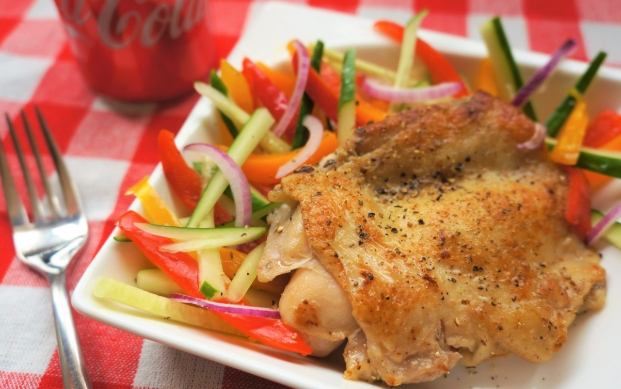 - 雞腿排皮那面檢查有無雜毛,拔乾淨。用廚房紙巾徹底擦乾,特別是皮的表面!(濕答答的皮不可能脆!)