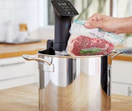 - 啟動機器: 找個夠深的鍋子(湯鍋、收納盒),裝入足量的水(要能完全淹過袋子裡的食物)。裝上舒肥棒,蓋上蓋子或用保鮮膜、鋁箔紙蓋住減少蒸發和熱散失(省電又維持水溫穩定)。設定好溫度和時間,啟動!