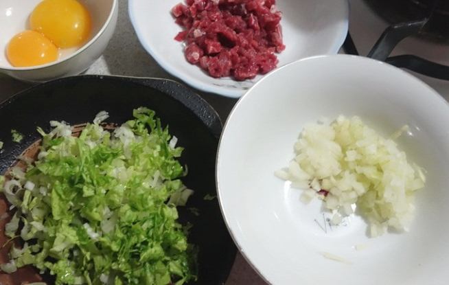 - 滑蛋: 中大火入鍋,快速成形,看到大部分凝固就準備下牛肉(動作要快)。利用餘溫完成最後融合。小火慢炒?蛋會老掉。