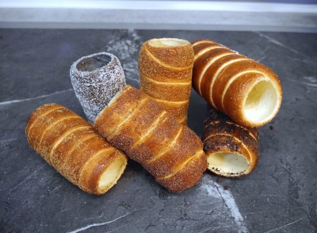 - 煙囪捲 (Trdelník): 滿大街都是!麵團捲在木棍上烤,外灑糖粉肉桂粉。新鮮烤好的外酥內軟,但務必選現烤的! 冷的很難吃。常見加冰淇淋或水果。吐槽: 這其實起源於匈牙利/斯洛伐克,不算地道捷克小吃,但觀光客(包括我)還是忍不住買來拍照嘗鮮。價格差異大,靠近景點通常較貴。